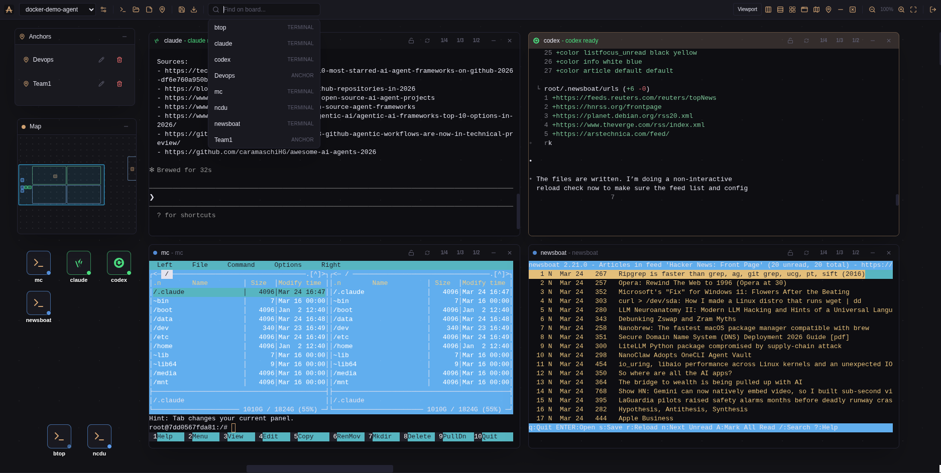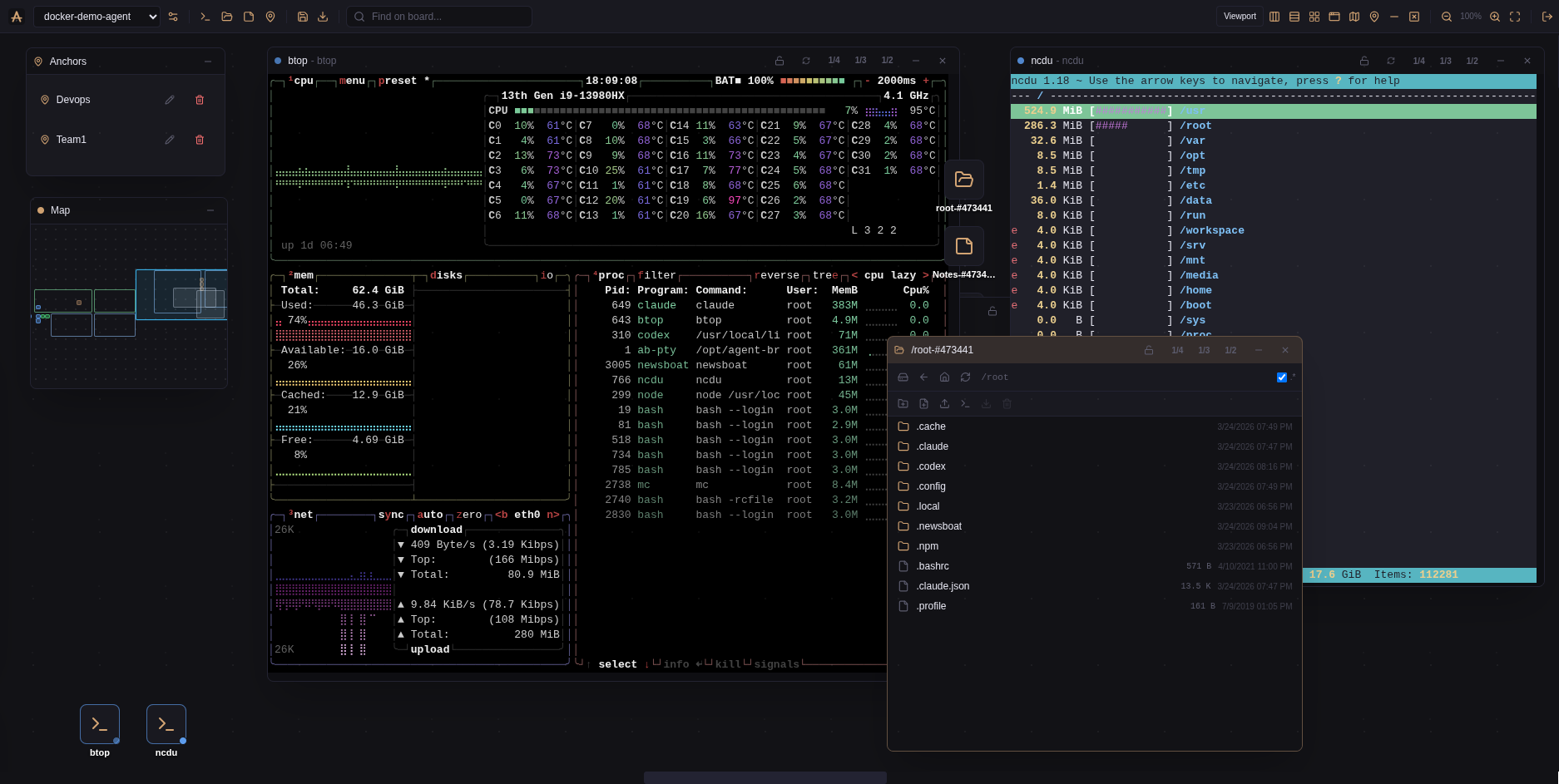 Not a dashboard with tables. A canvas where every window is a live terminal, agent, file manager, or note.